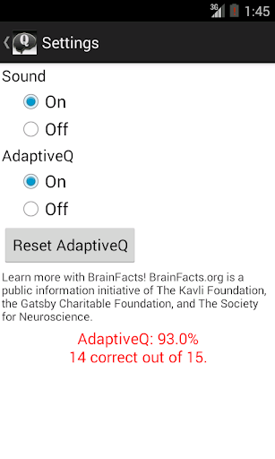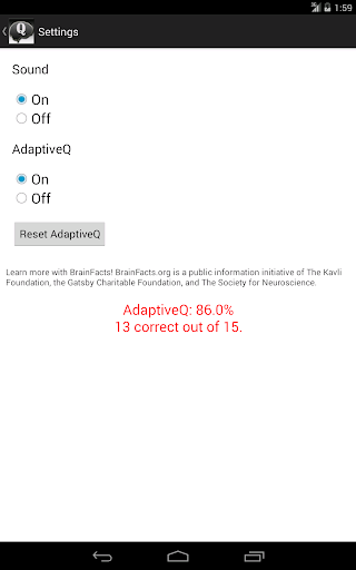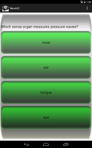 NeuroQ provides a fun, multiple choice quiz format for learning basic neuroscience facts. There are 200 questions. Sounds and video reinforce correct answers. The Adaptive Q algorithm increases presentation of previously missed questions.