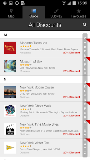• The Guide: compact guide with information on the most popular New York attractions (Circle Line Downtown, 5th Avenue, Central Park Zoo, New York Aquarium, others), museums, galleries, restaurants, shops, and other points of interest.