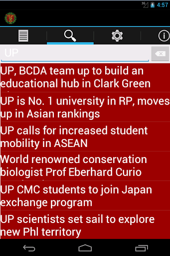 NewsApp is an application that fetches news articles from the University of the Philippines website, www.up.edu.ph. Each article can be shared via E-mail, Facebook and Twitter. A search feature is also included to find older articles.