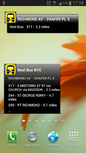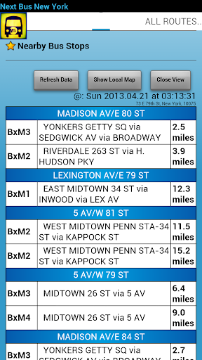 Next Bus New York Pro brings this service to Android, with a host of features. Search by bus route or stop code to find your bus stop, or select from a list of bus stops nearby. Next Bus New York Pro will display a list of all buses arriving at bus stops nearby, using your phones gps. View a map of the bus stop and surrounding area (map updates as you move to / from your bus stop).