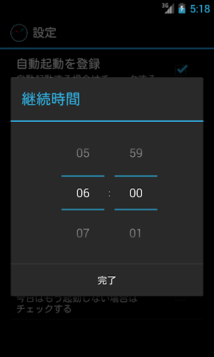 ユーザーが起動した場合は、充電中でなければ5分で終了します。但し、画面回転を行った場合はその時点から5分後に終了します。