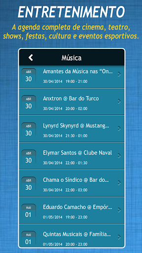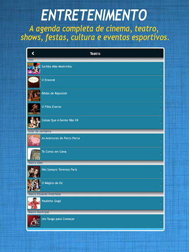 Contando com uma Infra-estrutura devidamente organizada para estar constantemente atualizado com o que há de melhor na cidade, o aplicativo informa a programação completa de cultura e entretenimento, incluindo eventos esportivos, feiras, mostras, exposições, shows, festas, cinema e teatro.