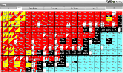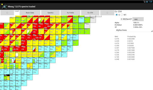 Nkeag Android Nuclide map Explorer shows the data on the known isotope states (about 3000 different nuclides). All stable nuclei and known radioactive nuclei, both naturally occurring and manmade, are loaded, along with their decay properties. Nkeag loads data from binary file installed. No internet/phone connections/user data required.