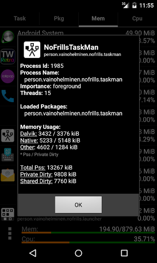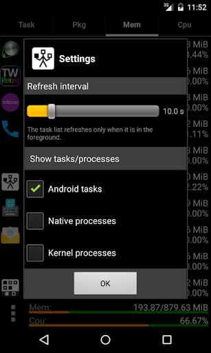 Shows memory and CPU usage of all running processes on your device. You can hide Android, native, or kernel processes from settings. Clicking a task will show more details about that process.