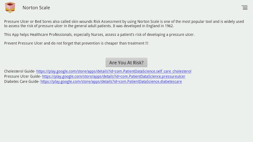 Norton Scale is one of the most popular and widely used tool to assess the risk of pressure ulcer or bed sores or wound sores in adult patients. It was developed in England in 1962. We have developed this App to help general public and Healthcare Professionals by making it easier to use, easier to navigate and interactive.