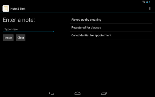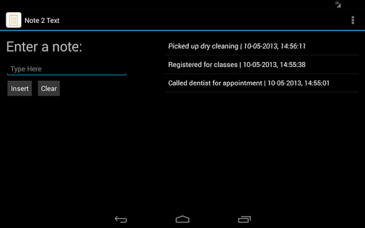 Note 2 Text Free is a simple note taking application that takes your short notes, timestamps them, and adds them to a text file that can be opened on almost any device or computer for later browsing. This application creates a text file on the root of your sdcard with a txt extension. You can change the location of the file and/or rename it. This application was designed to be tablet friendly. With full Dropbox integration coming soon, you can sync your notes across all your devices just by storing the note file in a Dropbox folder!