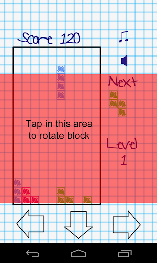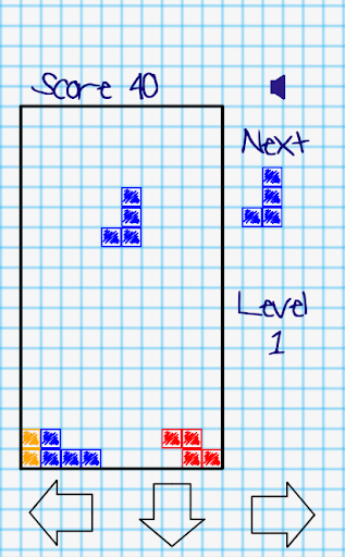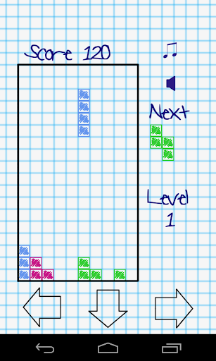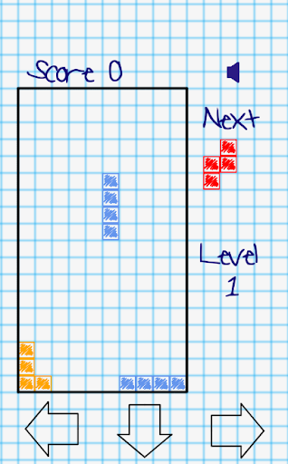Welcome to well-know to all tile-matching puzzle game with cool notebook style graphic. Control falling blocks by rotating them or move to left or right to make straight line and earn points for erasing it. More line erased at the same time equals to earn more points - remember that! :) Moreover be careful to not reach the top line of the frame because it will make you lose :(