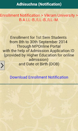 Adhisuchna (Notification) is a notice circulated by the University for different purposes i.e. Admission Notification, Enrollment Notification, Examination Form Filling Notification, Examination Time Table Notification and Notification for Result Declaration.