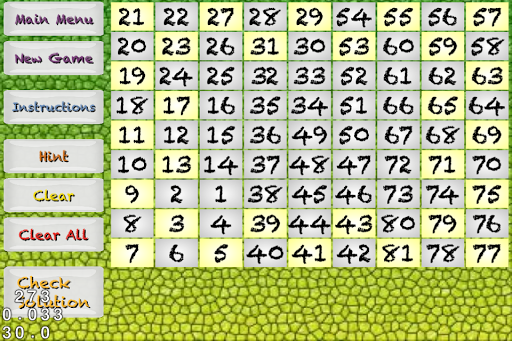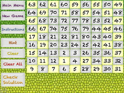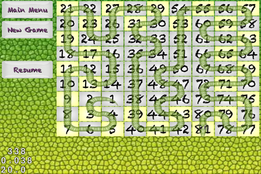 Number Snake is a fun number game where you fill in boxes with sequential numbers until you have completed the puzzle. Every adjacent box has to have a number that is one greater or one less than a box next to it (no diagonals). Thus making an unbroken path of numbers from 1 to the maximum number in a puzzle (e.g. from 1 to 49 on a 7x7 puzzle). It is similar to the game Numbrix from Parade magazine. These are the key differences: (1) Customizable puzzle sizes (5x5 to 20x20) (2) Puzzles with multiple solutions (3) Infinite puzzles available (4) Customizable puzzles.