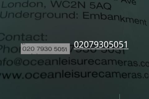 Use Number Speaker to take the hassle out of numbers by scanning them with a single finger tap - use it on business cards, directories, contact details in leaflets or adverts, or anything that has the number you want without the need to decipher small text or type lots of digits. It also works on other kinds of number you may need to note down quickly, such as product codes, serial numbers, zip codes, and so on.