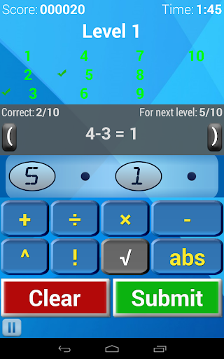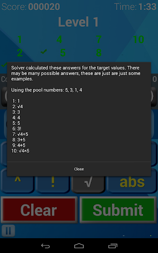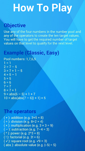 Use any of the four numbers in the number pool and any of the operators to create the ten target values. You will have to get the required number of target values on that level to qualify for the next level.