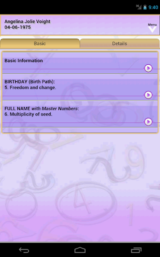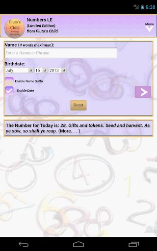 Numbers LE is the free version of the Numbers PCE App. It features features written interpretations from the book "Numerology - Multiple Digits & Decanates" by Esther V. Leinbach. These unique interpretations include numbers up to 100, however in this free version all names and birthday numbers are reduced to a single digit. All applicable numbers are displayed so if you already own the book, you can use this app to calculate the numerology and read the numbers directly out of the book.