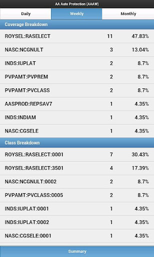 - Piece and $ volume broken down by Administrator, Coverage, Class, Deductible, Finance Company, Odometer Grid,