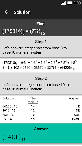 The program enables to convert numbers (including decimal fractions) between number systems with bases from 2 to 36. It is very easy to use and has the opportunity to display the solution algorithm.