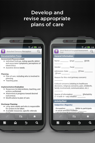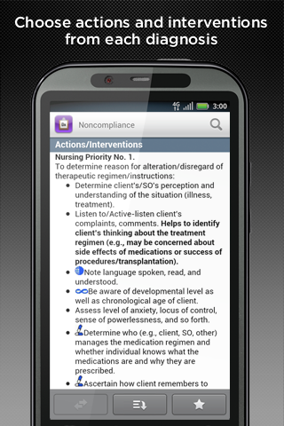 Make accurate nursing diagnoses and develop effective care plans with this comprehensive app. Each diagnosis listing includes a definition, related factors, defining characteristics, prioritized actions/interventions, NIC/NOC classifications, and documentation guidelines. Or, choose by patient symptom and link directly to associated nursing diagnoses.