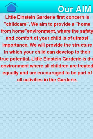 Garderie préoccupation Little Einstein est «garde d'enfants». Nous visons à fournir une "maison" environnement où la sécurité et le confort de votre enfant est d'une importance primordiale. Nous allons fournir la structure dans laquelle votre enfant peut développer leur plein potentiel. Garderie Little Einstein est l'environnement où tous les enfants sont traités de manière égale et sont encouragés à participer à toutes les activités du centre