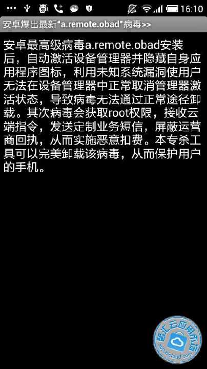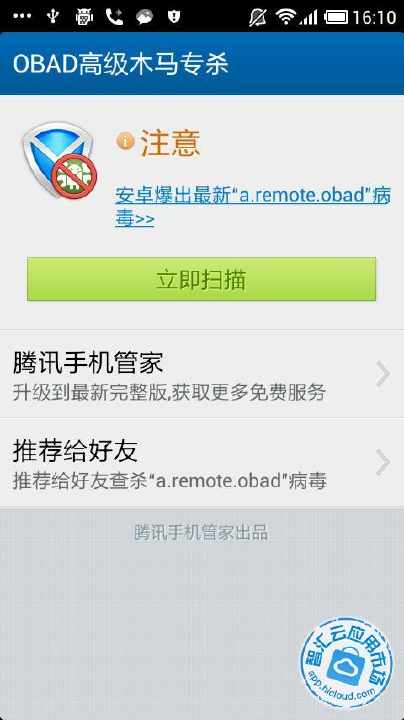 腾讯手机管家发布OBAD高级木马专杀工具,针对安卓最高级病毒a.remote.obad安装后,利用未知系统漏洞使得病毒无法通过正常途径卸载。该病毒一旦激活会接收云端指令,实施恶意扣费。本专杀工具可以完美卸载该病毒。