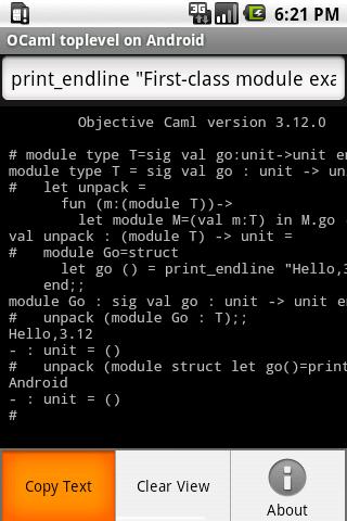 Experimental build of OCaml toplevel (interactive mode or interpreter) on Android. OCaml (Objective Caml) is a variant of Caml, which is a general-purpose programming language, designed with program safety and reliability in mind (quoted from OCaml homepage). See `about' dialog for license. Source code (and patch for cross-compiler on ARM-eabi) is fully available at https://bitbucket.org/keigoi/ocaml-toplevel-android/