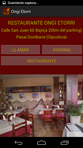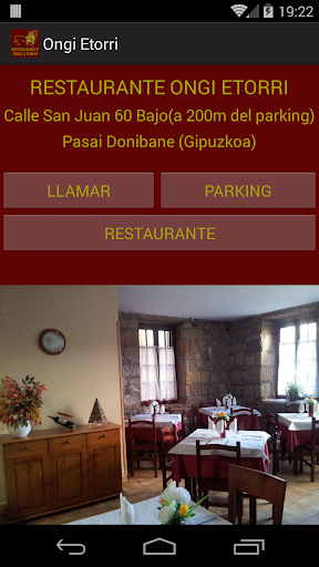 Aplicación guía del Restaurante Ongi Etorri de Pasai Donibane a 10 minutos de Donostia - SanSebastian, dispone de un botón de llamada, guía de google maps hasta el parking del pueblo y otra desde el parking hasta el restaurante andando (esta a 200 metros).