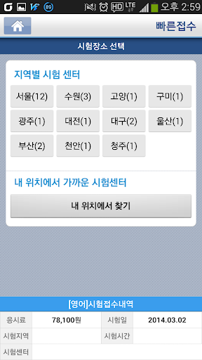 - 접수 진행 시 센터 우측의 버튼 클릭 시 위치에 대한 지도 정보(GPS)서비스 화면으로 이동하여 해당 고사장의 위치가 지도로 보여집니다.