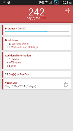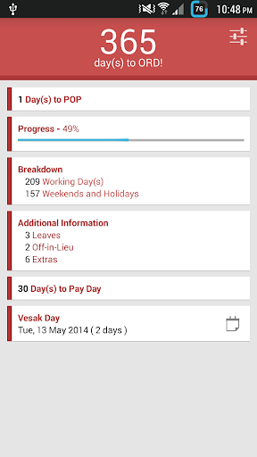 ORD COUNTDOWN is a useful reminder for all guys who are serving the nation. It is packed with a ton of helpful features to aid the user towards his march to ORD; it's the most downloaded ORD countdown app in the Google Play Store.