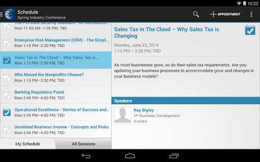 The OSCPA Events and Meetings app data syncing feature allows you to share your event and itinerary info across all of your mobile devices.