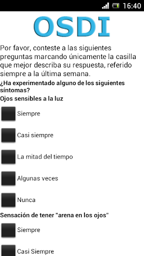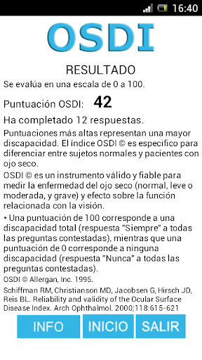 OSDI © (ocular surface disease index) es un sencillo test creado para establecer una clasificación del ojo seco según su sintomatología y gravedad. Consiste en 12 preguntas sobre situaciones relacionadas con la sintomatología experimentada por el paciente en la última semana. Al final, se realiza la puntuación del test en función de las respuestas marcadas, y del número de respuestas contestadas por el paciente.