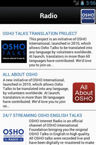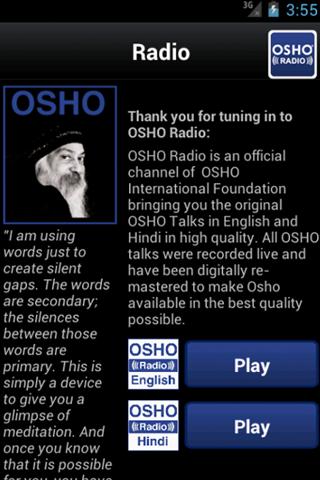 Osho Radio brings the wonderful audio and music from the world of osho (radio.osho.com) to your mobile phone. Now listen to Osho Radio in English or Hindi - anytime on the go.