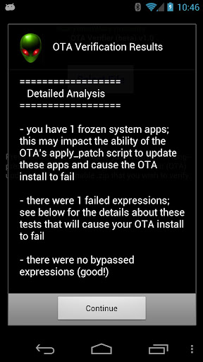 1. Savvy root users probably already know that after a failed .zip file installation, you should be able to view the /cache/recovery/last_log file to view the information about what might have failed. OTA Verifier will try to uncover all of the issues and not just the first one that causes the installation to fail.