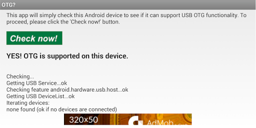 Wondering if your phone/tablet would support a USB OTG device? Some do, some do not. This app will determine that for you. NOTE: This does NOT enable OTG or make any changes, it only CHECKS whether OTG (On The Go / USB Host) is supported or not.