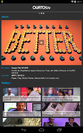Regardez en direct, ou en Replay, la 1ère chaîne dédiée à l'actualité High-Tech et aux loisirs. OUATCH TV, c'est la chaîne de tous les écrans : ceux dont nous parlons (smartphones, tablettes, TV, ordinateurs, objets connectés), et ceux sur lesquels vous pouvez regarder OUATCH TV. Et donc, bienvenue sur Android !