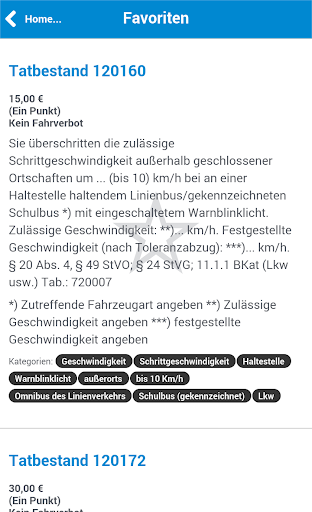 Alle Tatbestände sind nach Schlagworten kategorisiert. So lässt sich ein gesuchter Tatbestand anhand von Kategorien wie "Parken" oder "Geschwindigkeit" schnellstmöglich finden. Eine zusätzliche Suchfunktion erlaubt das Auffinden von Tatbeständen anhand von frei wählbaren Begriffen.