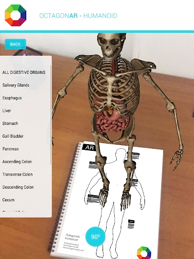 This app allows you to explore human body parts in details. You can experience the anatomy exploration in Augmented Reality experience using marker provided (App screenshot with AR label).