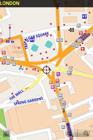 Touch and drag to move map, pinch to zoom, tap on + button to zoom in, tap on - button to zoom out, tap on an object (street or point) to view its name, double tap or touch and hold (long press) on an object (street or point) to set that object as start waypoint or target waypoint.