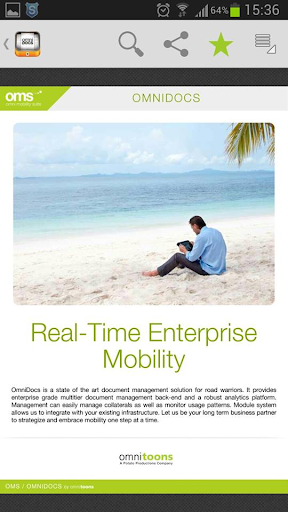 OmniDocs is a document management solution to help company quickly distribute documents to its employees carrying smart phones and tablets. Administrator can upload documents at a web portal, share to authorized groups of users and push-notify them. At the mobile device, the user will receive the notification to synchronize the new document. Once the document is downloaded, the documents can be viewed without network connection. You can also annotate on the PDF documents and email the document with your annotations to your colleagues.