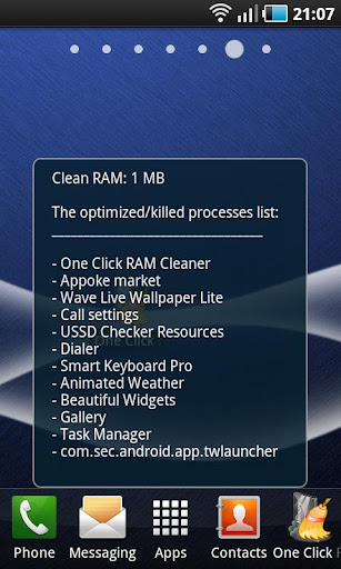 Whether you want to optimize performance of your system with as little effort as possible, One Click RAM Cleaner is the tool of choice. No other program is as easy to use as One Click RAM Cleaner. Get more available storage space by clearing cache/data files with this app. Just in one click clear all cached files for getting more available space. Terminate threatening processes and programs or release memory occupied by listed processes. You can use this app as a widget-like shortcut on your home screen. For convenience, you can even add an icon of the application to your launcher. No root permission required.