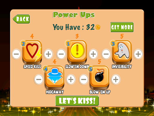 *Speed kissing: Use this power-up to get in some real quick smooches with your hot crush. Be fast though, because you only get ten seconds per use.