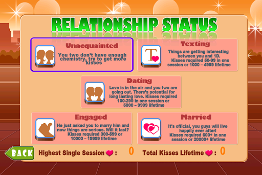 For every relationship status you achieve, you guys find a different make out spot! Or choose your own make out spot! And choose different cuties to kiss!