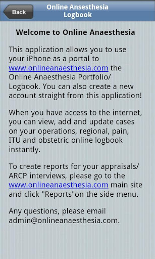 Bienvenido a la Online Anaesthesia. Esta aplicación te permite usar tu iPhone como un portal para www.onlineanaesthesia.com - la línea de anestesia Portafolio / Libro de ruta. También puede crear una nueva cuenta directamente desde esta aplicación! Cuando usted tiene acceso a Internet, usted puede ver, agregar y actualizar los casos en sus operaciones, de dolor regional, la UCI y la bitácora en línea al instante obstétrica. Para crear informes para sus apreciaciones o evaluaciones, por favor vaya a www.onlineanaesthesia.com y haga clic en "Ver informe" en el menú de la izquierda. Cualquier pregunta, por favor admin@onlineanaesthesia.com correo electrónico