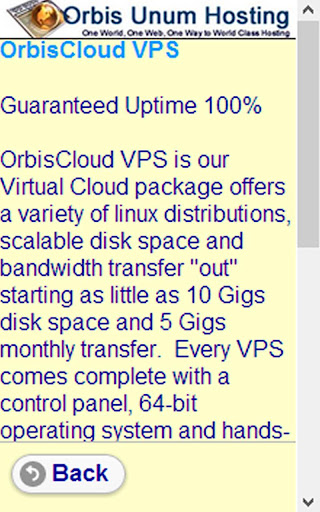 Orbis Hosting Mobile App gives you instant access to our latest products, Facebook and Twitter pages and the current web hosting news available on the Internet.