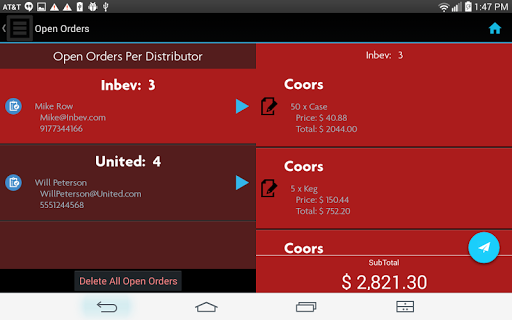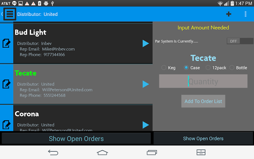 The Orders In app will allow you to create, maintain and send your Products and Inventory orders from your Phone or Tablet. You have the option to use the PAR system (inputting in the inventory on hand to allow you to maintain a base level of products and inventory) or simply turn par off and make a direct order to your distributor inputting the inventory amount needed. All order history is saved directly to your phone and can be viewed any time in the "Orders History" page. Simple and clean. If a hard copy of your inventory orders is needed simply email your order history page to yourself and print.