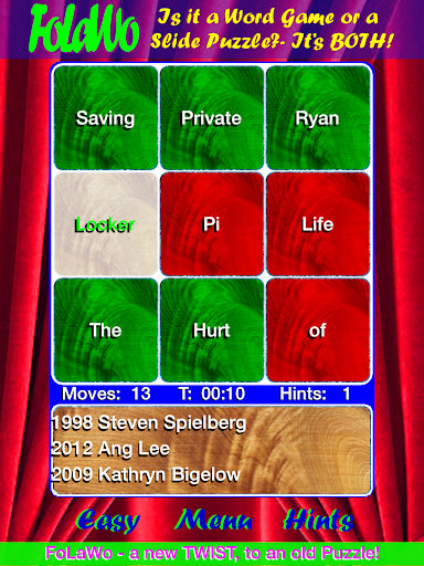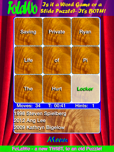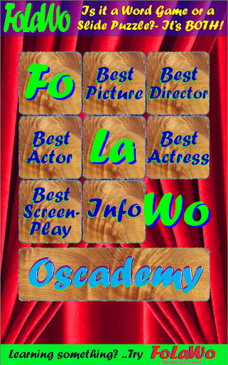 The game uses the Oscar, Academy Award winners for Best Picture, Best Director, Best Actor, Best Actress, & Best Screenplay. It uses the FoLaWo™ concept of using words, instead of the classic numbers/pictures on the tiles.
