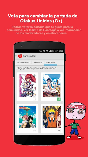 Y ahí no acaba todo, OtakUn esta en estrecha relación con la Comunidad de Google+ Otakus Unidos. Podremos ver información de los moderadores, acceder a sus perfiles de OtakUn o Google+, ver la lista de Hashtags creados en la Comunidad, y votar cual es la portada que más nos gusta para la comunidad.