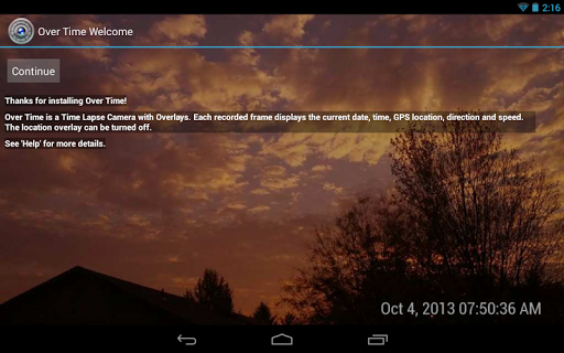 Record your own HD Time Lapse Videos with your phone or tablet. Over Time is a Time Lapse Camera with Overlays. Each recorded frame displays the current date, time, GPS location, direction and speed. The location overlay can be disabled.