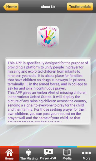 This APP is specifically designed for the purpose of providing a platform to unify people in prayer for missing and exploited children from infants to nineteen years old. It is also a place for families that have children on drugs, runaways, in prisons, terminally ill, in the armed forces, and in college to ask for and join in continuous prayer.
