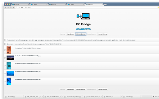 Cuando quieras volcar todos tus compartidos al PC solo tienes que abrir tu navegador web preferido de escritorio (FireFox, Chrome o Safari) y cargar la url que aparece en la parte superior de PCBridge; algo del tipo “http://192.168.1.105:8585”.