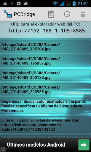 PCBridge está esperando que otras aplicaciones compartan contenido, es decir, con la típica acción de "compartir" por ejemplo en Twitter compartes el contenido con PCBridge o desde la Galería de imágenes. Todos los contenidos se irán añadiendo desde otras aplicaciones para poder consultarlo más tarde desde tu PC. Además, también puedes añadir contenido a PDBridge mediante el botón "Pegar del Portapapeles”. Cuando quieras pegar contenido del portapapeles tienes que abrir PCBridge y pulsar el botón "Pegar del Portapapeles".