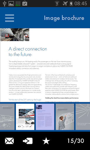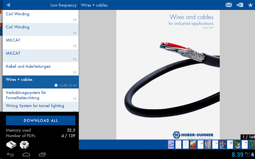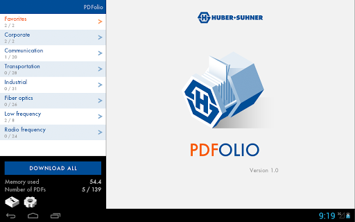 The “PDFolio” App from HUBER+SUHNER AG is a simple tool, it gives you the possibility to browse through all HUBER+SUHNER brochures and catalogues. Select which of about 140 papers should be downloaded on your Tablet. Updates of the papers will be announced by starting the App.