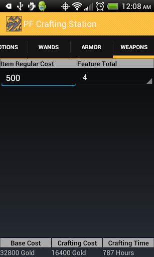 Lightweight application to calculate item crafting costs and time for a variety of item types including: wands, scrolls, potions, weapons, and armor for use with the Pathfinder RPG