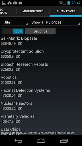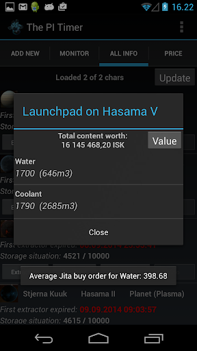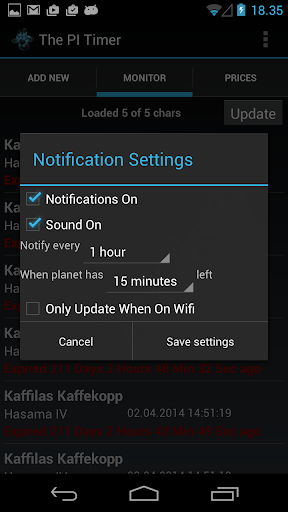 The PI Timer for Eve Online is designed to monitor all your running extractors and notify you when they expire. Let the app pull all characters from your account in one simple operation, and show their extractors sorted by the first one to expire.